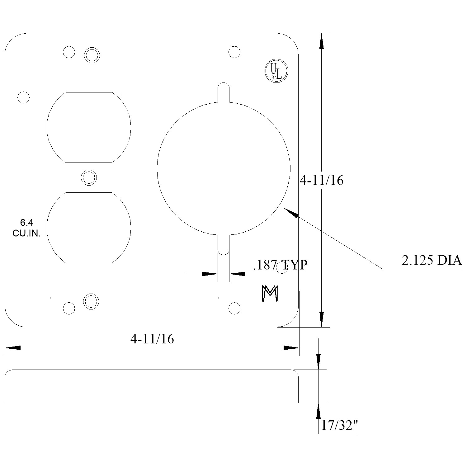 (1) Duplex (1) 2.125 in. dia. Receptacle | 4-11/16 inch square |